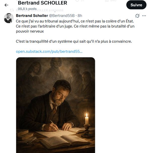 https://x.com/55Bellechasse (voir les commentaires à chaud avant la fermeture de ce compte)) https://bertrand55.substack.com/ https://www.youtube.com/@bertrandscholler8699 https://x.com/Bertrand55B (compte de secours)