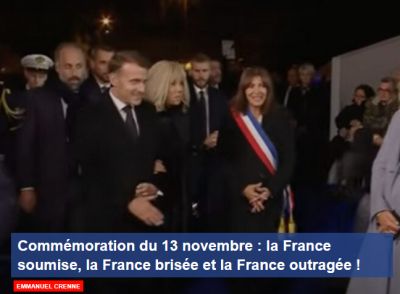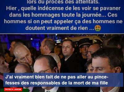 MISE A JOUR DU 14.11.2025 : Typiquement, ce sont les responsables d'avoir laissé se créer les conditions du massacre, Cazneuve et Vals en tête, qui se dédouanent avec ce genre de mascarade. Patrick Jardin n'est pas invité. Vous avez dit comment ? Article de GALA, les Thénardiers de l'Élysée n'ont pas raté l'occasion : recueillement à l'abri des caméras = trouille de se faire huer.