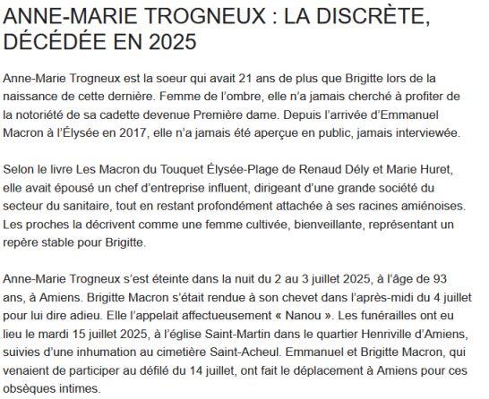 MISE A JOUR DU 03.04.2026 : Apparition d'un site bizarre, qui se présente comme le blog du très discret Sébastien AUZIÉRE, repéré par PRESSIBUS : http://pressibus.free.fr/gen/trogneux/fil.html#65 C'est évidemment un contre-feu pour semer la confusion. Le style lèche-bottes est typique de la presse people, Gala en particulier, les illustrations sont générées par IA à partir de clichés n'ayant rien à voir, on voit réapparaître le collègue de JMT présenté comme le mari, et on ne devrait pas tarder à revoir mon grand copain Henri le "¨Petit Gros". On nous cause petite retraite : https://www.sebastien-auziere.fr/blog/retraite-brigitte-macron-montant/ alors que la fortune de JMT qui a cumulé deux héritages est conséquente. Le collectif SALES CONNES aurait quelques difficultés à coller "Brigitte" au tribunal vu le montant de la consignation. Moussa veille au grain. Le paragraphe consacré à Anne-Marie (Annie) TROGNEUX (épouse BOULOGNE) est intéressant, car il souligne l'écart de 21 ans entre les deux soeurs, rappel, dans le scénario "NièceA" la vraie Brigitte est la fille d'Anne-Marie, le père étant Louis AUZIÈRE, frère de de Jean-Louis AUZIÈRE, épousailles Catherine AUDOY et sa fameuse page facebook aux deux peintres : https://www.action-patriote.fr/bimbo_et_mickey.htm . Il y a d'ailleurs une erreur de date, sur la "visite" rendue... après sa mort. Quand vous mentez les gars faites un peu attention. On apprend au passage que JMT l'appelait "Nanou", en tant que soeur ou tante de la vraie Brigitte ? A suivre donc.