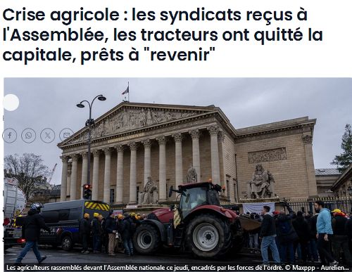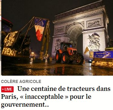 MISE A JOUR DU 09.01.2026 : La poulette Yaël, descendue de son perchoir, s'est retrouvée dans la basse cour de l'Assemblée Nationale entourée de coqs Gaulois un peu remontés. Je le rappelle, ce fier gallinacé est le seul volatile à chanter les pieds dans la merde. Bravo à notre rusé Aveyronnais qui est le seul à être parvenu à s'infiltrer jusque devant l'Assemblée Nationale en utilisant toutes les ficelles pour échapper à la tagada tactique des gendarmes, bien connue des paysans, le braconnage est formateur. N'empêche que les "agriculteurs" ont réussi là où les gilets jaunes et les émeutiers de février 34 ont échoué, avec en plus une occupation symbolique de la Tour Eiffel et de l'Arc de Triomphe. Avertissement sans frais aux minets narcissiques et immatures : la Gueuse vient de sentir le vent du boulet parfumé à la bouse de vache. Retenons aussi le plantage magistral de mon grand copain Nunuche, avec en prime une émeute Marocaine. Cette affaire prouve en tous cas que les lieux de pouvoir sont de facto très vulnérables : trois VBCI et le problème est réglé. Voir aussi : https://ripostelaique.com/le-combat-de-nos-paysans-et-le-djihad-des-supporters-algeriens-et-marocains.html https://ripostelaique.com/exceptionnelle-action-de-nos-agriculteurs-a-paris-vaincre-ou-mourir.html https://ripostelaique.com/braun-pivet-huee-aurait-demande-aux-paysans-daller-nourrir-ses-poules.html